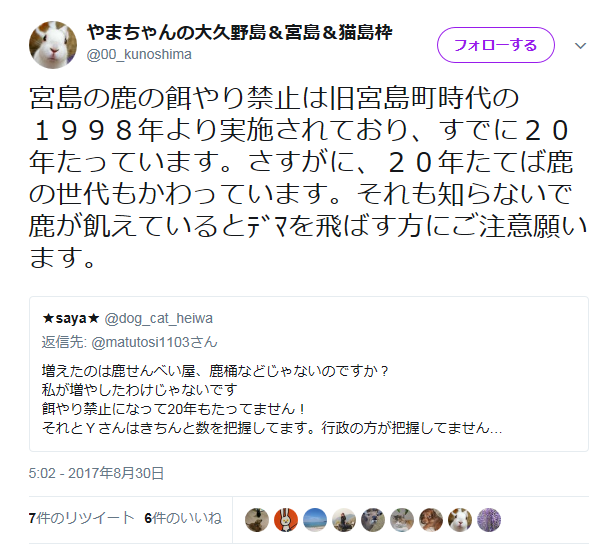 宮島の鹿の餌やり禁止は旧宮島町時代の1998年より実施されており、すでに20年たっています。さすがに、20年たてば鹿の世代もかわっています。それも知らないで鹿が飢えているとデマを飛ばす方にご注意願います。 https://t.co/QJkyiHbCdE— やまちゃんの大久野島&宮島&猫島枠 (@00_kunoshima) 2017年8月30日