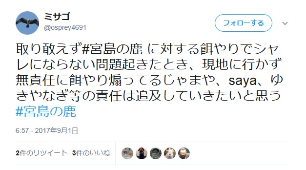 取り敢えず#宮島の鹿 に対する餌やりでシャレにならない問題起きたとき、現地に行かず無責任に餌やり煽ってるじゃまや、saya、ゆきやなぎ等の責任は追及していきたいと思う#宮島の鹿— ミサゴ (@osprey4691) 2017年9月1日