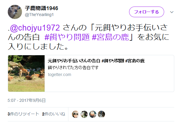 .@chojyu1972 さんの「元餌やりお手伝いさんの告白 #餌やり問題 #宮島の鹿」をお気に入りにしました。 https://t.co/xmxiCLW13T— 子鹿物語1946 (@TheYearling1) 2017年9月6日
