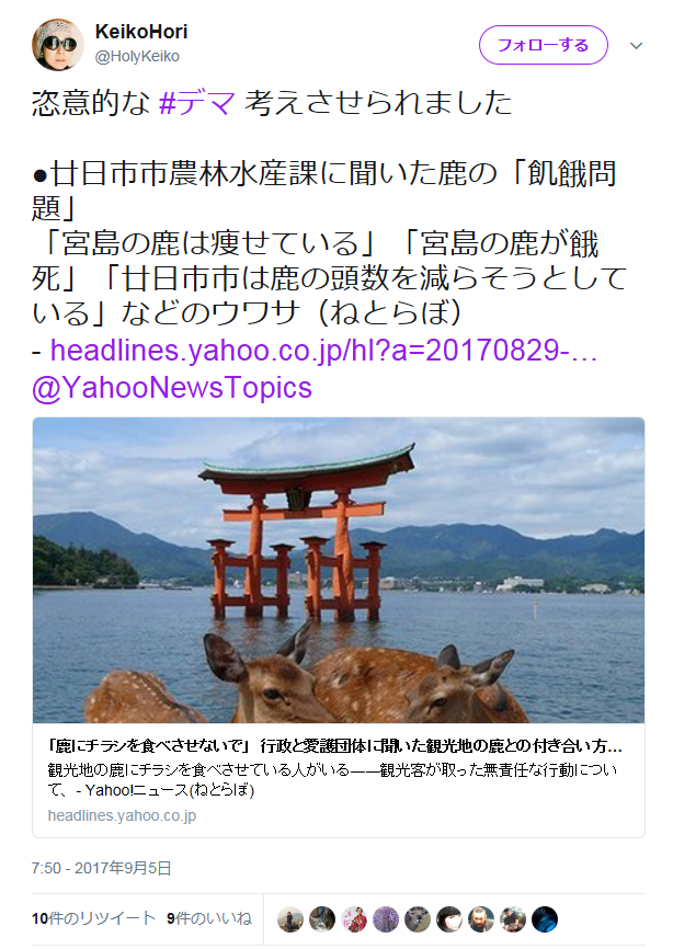 宮島の鹿のアンチの一人のツイート。@TheYearling1 らがRT。発言者がデマと呼んでいる問題は実際には断言する根拠がない。この発言者は別のツイートで米田さんのブログを無断転載している。(削除した @ShikaTsuushin において) |