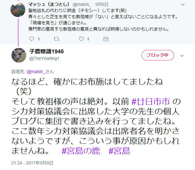 なるほど、確かにお布施はしてましたね(笑)そして教祖様の声は絶対。以前 #廿日市市 のシカ対策協議会に出席した大学の先生の個人ブログに集団で書き込みを行ってましたね。ここ数年シカ対策協議会は出席者名を明かさないようですが、こういう事が原因かもしれませんね。 #宮島の鹿 #宮島— 子鹿物語1946 (@TheYearling1) 2017年9月9日