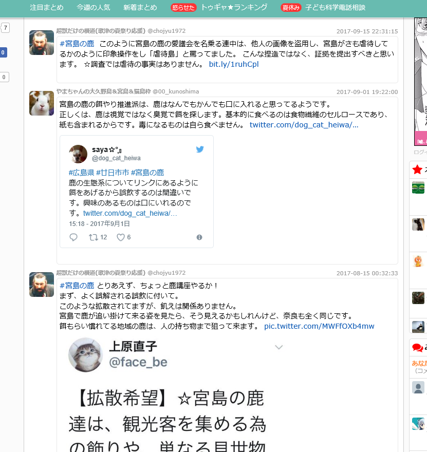 宮島の鹿の支援者のツイート(これらはスクションを取って自分のツイートとしている)をデマと中傷。