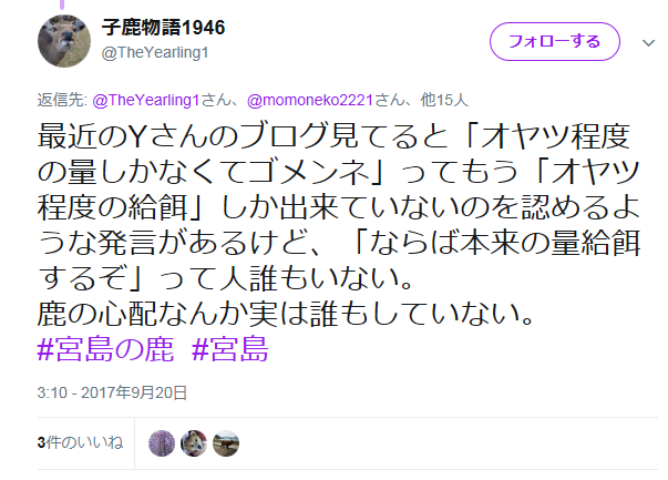 最近のYさんのブログ見てると「オヤツ程度の量しかなくてゴメンネ」ってもう「オヤツ程度の給餌」しか出来ていないのを認めるような発言があるけど、「ならば本来の量給餌するぞ」って人誰もいない。鹿の心配なんか実は誰もしていない。#宮島の鹿 #宮島— 子鹿物語1946 (@TheYearling1) 2017年9月20日
