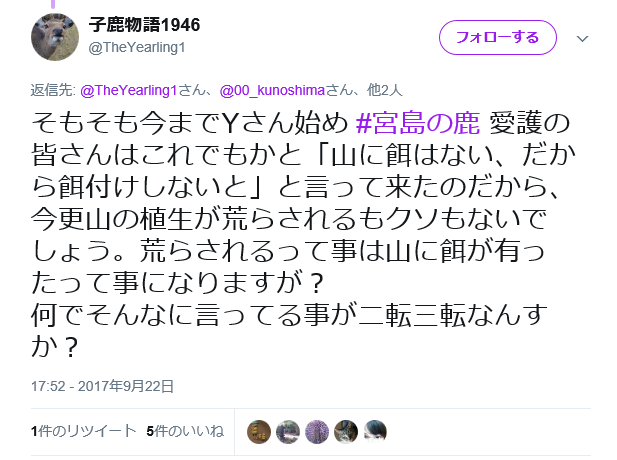 そもそも今までYさん始め #宮島の鹿 愛護の皆さんはこれでもかと「山に餌はない、だから餌付けしないと」と言って来たのだから、今更山の植生が荒らされるもクソもないでしょう。荒らされるって事は山に餌が有ったって事になりますが?何でそんなに言ってる事が二転三転なんすか?— 子鹿物語1946 (@TheYearling1) 2017年9月23日