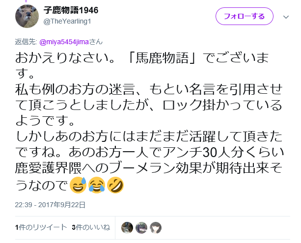 おかえりなさい。「馬鹿物語」でございます。私も例のお方の迷言、もとい名言を引用させて頂こうとしましたが、ロック掛かっているようです。しかしあのお方にはまだまだ活躍して頂きたですね。あのお方一人でアンチ30人分くらい鹿愛護界隈へのブーメラン効果が期待出来そうなので😅😂🤣— 子鹿物語1946 (@TheYearling1) 2017年9月23日