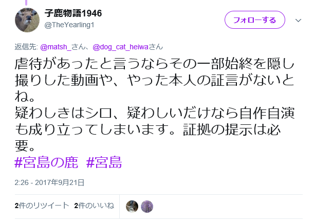 虐待があったと言うならその一部始終を隠し撮りした動画や、やった本人の証言がないとね。疑わしきはシロ、疑わしいだけなら自作自演も成り立ってしまいます。証拠の提示は必要。#宮島の鹿 #宮島— 子鹿物語1946 (@TheYearling1) 2017年9月21日