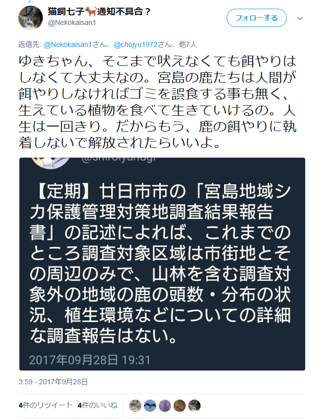 ゆきちゃん、そこまで吠えなくても餌やりはしなくて大丈夫なの。宮島の鹿たちは人間が餌やりしなければゴミを誤食する事も無く、生えている植物を食べて生きていけるの。人生は一回きり。だからもう、鹿の餌やりに執着しないで解放されたらいいよ。 pic.twitter.com/L6lrICOk2G— 猫飼七子🐈通知不具合? (@Nekokaisan1) 2017年9月28日