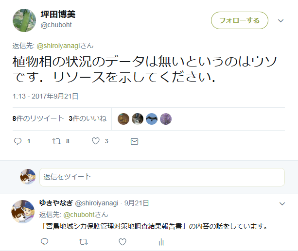 植物相の状況のデータは無いというのはウソです.リソースを示してください.— 坪田博美 (@chuboht) 2017年9月21日