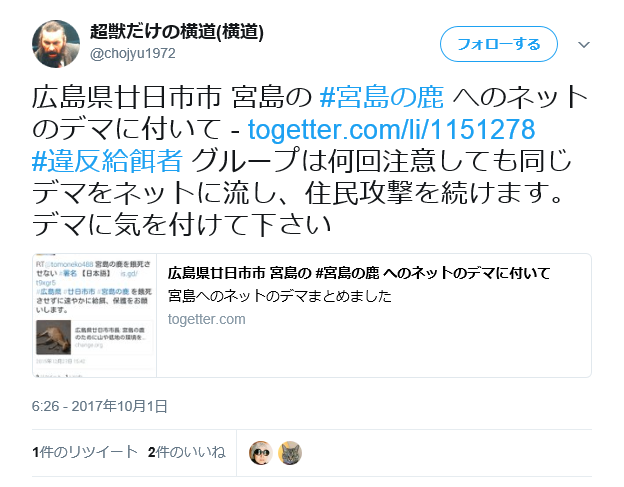 宮島の鹿に給餌をする方々や支援者を”違反給餌者”と呼び、デマを拡散していると主張。 このユーザーは@TheYearling1 と相互フォローの関係である。