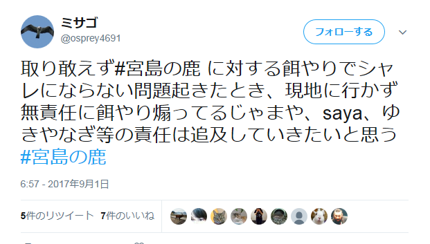 取り敢えず#宮島の鹿 に対する餌やりでシャレにならない問題起きたとき、現地に行かず無責任に餌やり煽ってるじゃまや、saya、ゆきやなぎ等の責任は追及していきたいと思う#宮島の鹿— ミサゴ (@osprey4691) 2017年9月1日