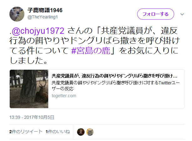 .@chojyu1972 さんの「共産党議員が、違反行為の餌やりやドングリばら撒きを呼び掛けてる件について #宮島の鹿」をお気に入りにしました。 https://t.co/DPRQ1mBFvn— 子鹿物語1946 (@TheYearling1) 2017年10月5日