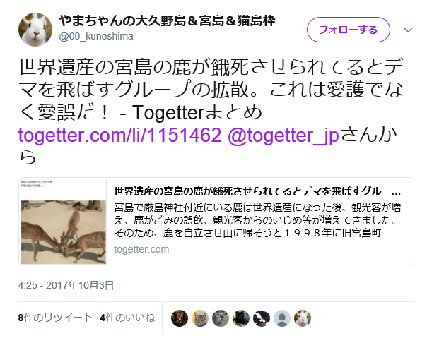 世界遺産の宮島の鹿が餓死させられてるとデマを飛ばすグループの拡散。これは愛護でなく愛誤だ! - Togetterまとめ https://t.co/ZInIKvUkyE @togetter_jpさんから— やまちゃんの大久野島&宮島&猫島枠 (@00_kunoshima) 2017年10月3日