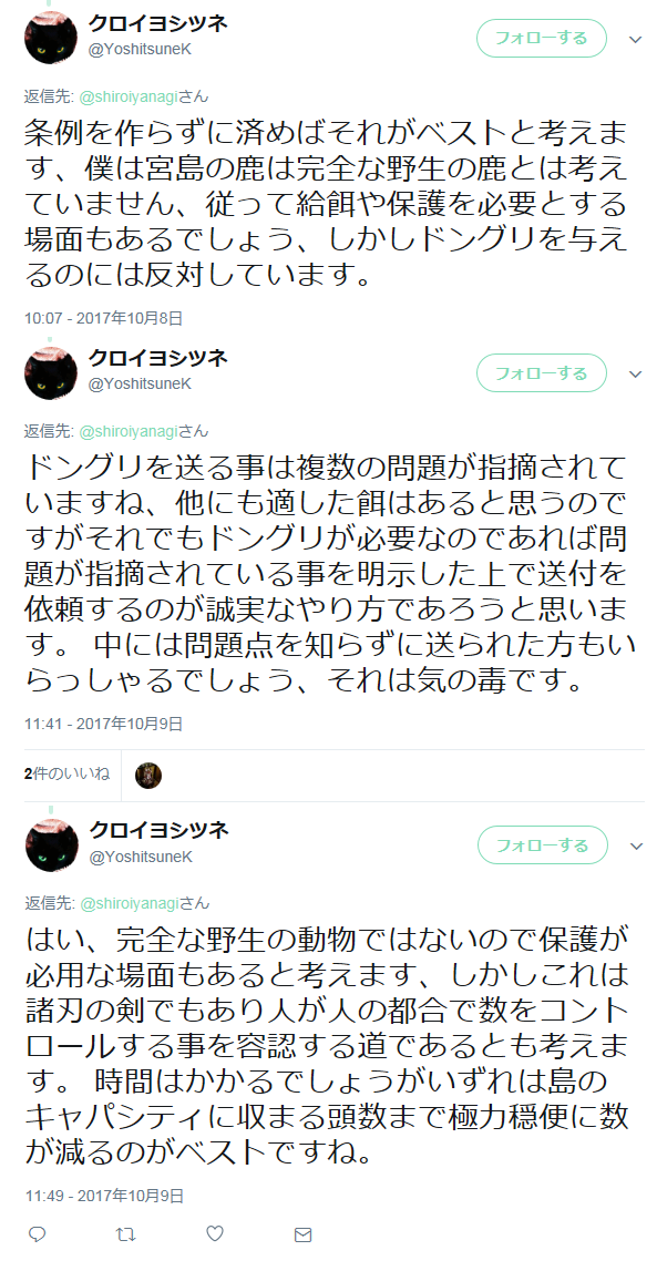 条例を作らずに済めばそれがベストと考えます、僕は宮島の鹿は完全な野生の鹿とは考えていません、従って給餌や保護を必要とする場面もあるでしょう、しかしドングリを与えるのには反対しています。— クロイヨシツネ (@YoshitsuneK) 2017年10月8日