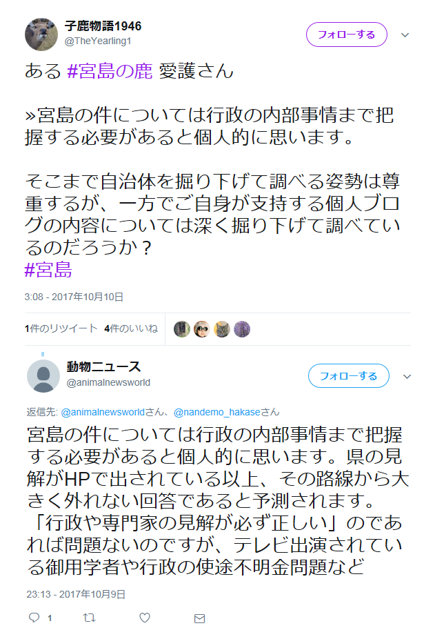 ある #宮島の鹿 愛護さん≫宮島の件については行政の内部事情まで把握する必要があると個人的に思います。そこまで自治体を掘り下げて調べる姿勢は尊重するが、一方でご自身が支持する個人ブログの内容については深く掘り下げて調べているのだろうか?#宮島— 子鹿物語1946 (@TheYearling1) 2017年10月10日