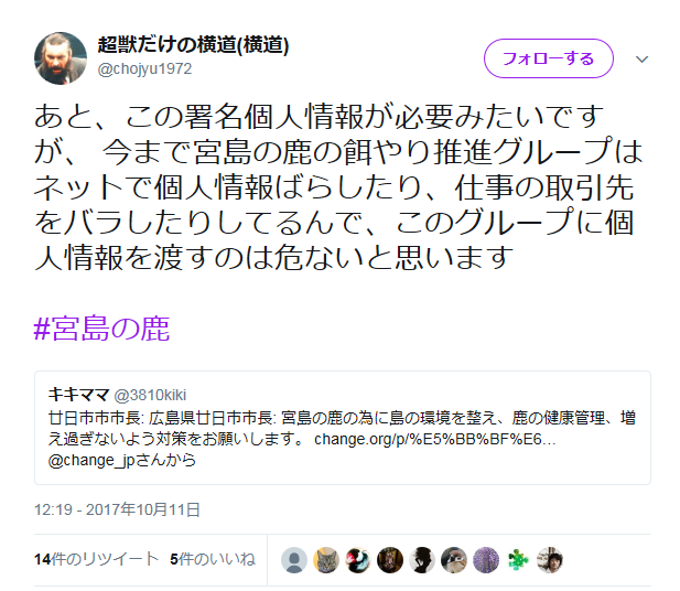あと、この署名個人情報が必要みたいですが、 今まで宮島の鹿の餌やり推進グループはネットで個人情報ばらしたり、仕事の取引先をバラしたりしてるんで、このグループに個人情報を渡すのは危ないと思います#宮島の鹿 https://t.co/58JeRetU3W— 超獣だけの横道(横道) (@chojyu1972) 2017年10月11日