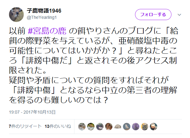 以前 #宮島の鹿 の餌やりさんのブログに「給餌の際野菜を与えているが、亜硝酸塩中毒の可能性についてはいかがか?」と尋ねたところ「誹謗中傷だ」と返されその後アクセス制限された。疑問や矛盾についての質問をすればそれが「誹謗中傷」となるなら中立の第三者の理解を得るのも難しいのでは?— 子鹿物語1946 (@TheYearling1) 2017年10月14日