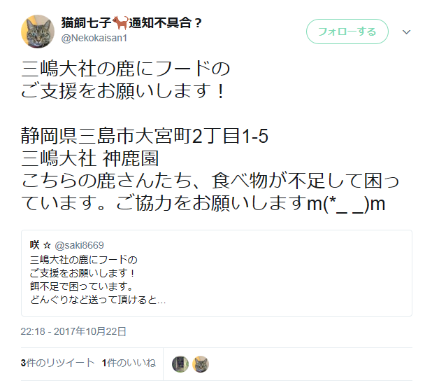 三嶋大社の鹿にフードのご支援をお願いします!静岡県三島市大宮町2丁目1-5三嶋大社 神鹿園こちらの鹿さんたち、食べ物が不足して困っています。ご協力をお願いしますm(*_ _)m https://t.co/ZpHKR0y1TE— 猫飼七子🐈通知不具合? (@Nekokaisan1) 2017年10月23日