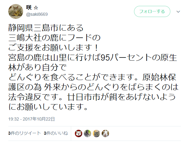 静岡県三島市にある三嶋大社の鹿にフードのご支援をお願いします!宮島の鹿は山里に行けば95パーセントの原生林があり自分でどんぐりを食べることができます。原始林保護区の為 外来からのどんぐりをばらまくのは法令違反です。廿日市市が餌をあげないようにお願いしています。— 咲 ☆ (@saki8669) 2017年10月23日