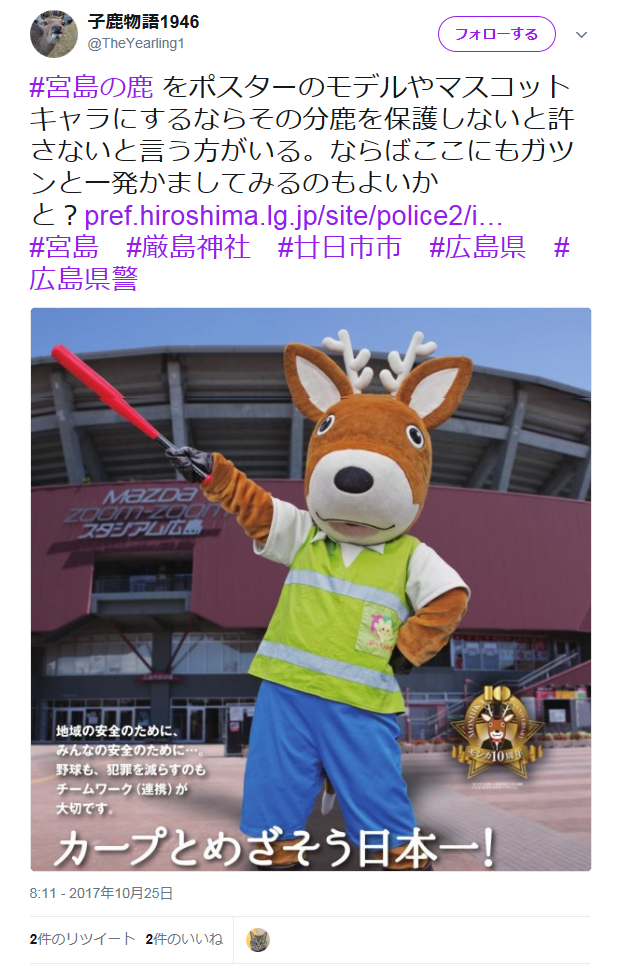 #宮島の鹿 をポスターのモデルやマスコットキャラにするならその分鹿を保護しないと許さないと言う方がいる。ならばここにもガツンと一発かましてみるのもよいかと?https://t.co/AQ9xseSqQz #宮島 #厳島神社 #廿日市市 #広島県 #広島県警 pic.twitter.com/70M4mpc5Iz— 子鹿物語1946 (@TheYearling1) 2017年10月25日