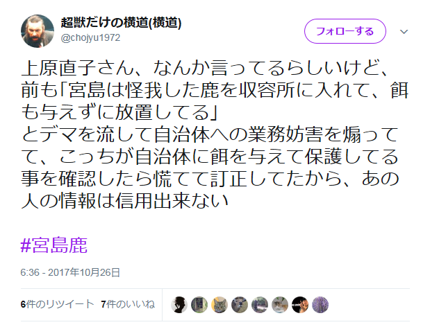 上原直子さん、なんか言ってるらしいけど、前も「宮島は怪我した鹿を収容所に入れて、餌も与えずに放置してる」とデマを流して自治体への業務妨害を煽ってて、こっちが自治体に餌を与えて保護してる事を確認したら慌てて訂正してたから、あの人の情報は信用出来ない#宮島鹿— 超獣だけの横道(横道) (@chojyu1972) 2017年10月26日