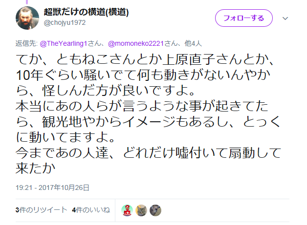 てか、ともねこさんとか上原直子さんとか、10年ぐらい騒いでて何も動きがないんやから、怪しんだ方が良いですよ。本当にあの人らが言うような事が起きてたら、観光地やからイメージもあるし、とっくに動いてますよ。今まであの人達、どれだけ嘘付いて扇動して来たか— 超獣だけの横道(横道) (@chojyu1972) 2017年10月27日