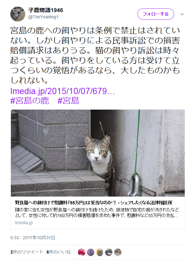宮島の鹿への餌やりは条例で禁止はされていない。しかし餌やりによる民事訴訟での損害賠償請求はありうる。猫の餌やり訴訟は時々起っている。餌やりをしている方は受けて立つくらいの覚悟があるなら、大したものかもしれない。https://t.co/DxCVwIeQUu#宮島の鹿 #宮島— 子鹿物語1946 (@TheYearling1) 2017年10月31日