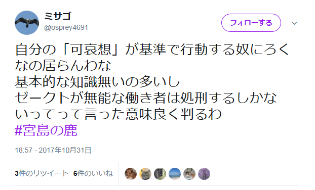 自分の「可哀想」が基準で行動する奴にろくなの居らんわな基本的な知識無いの多いしゼークトが無能な働き者は処刑するしかないってって言った意味良く判るわ#宮島の鹿— ミサゴ (@osprey4691) 2017年11月1日