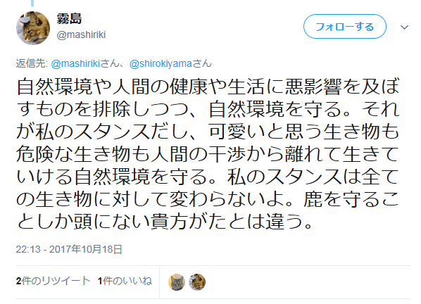自然環境や人間の健康や生活に悪影響を及ぼすものを排除しつつ、自然環境を守る。それが私のスタンスだし、可愛いと思う生き物も危険な生き物も人間の干渉から離れて生きていける自然環境を守る。私のスタンスは全ての生き物に対して変わらないよ。鹿を守ることしか頭にない貴方がたとは違う。— 霧島 (@mashiriki) 2017年10月19日