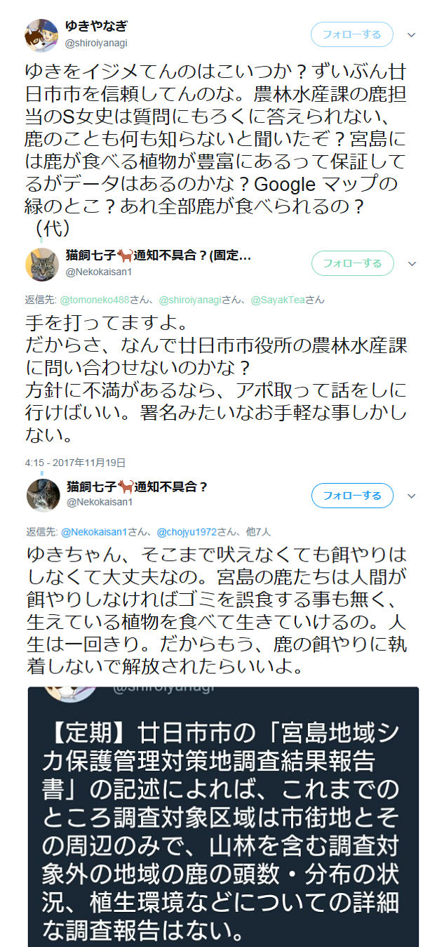 ゆきをイジメてんのはこいつか?ずいぶん廿日市市を信頼してんのな。農林水産課の鹿担当のS女史は質問にもろくに答えられない、鹿のことも何も知らないと聞いたぞ?宮島には鹿が食べる植物が豊富にあるって保証してるがデータはあるのかな?Google マップの緑のとこ?あれ全部鹿が食べられるの?(代) pic.twitter.com/WgqZA5u1sX— ゆきやなぎ (@shiroiyanagi) 2017年12月1日