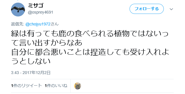 緑は有っても鹿の食べられる植物ではないって言い出すからなあ自分に都合悪いことは捏造しても受け入れようとしない— ミサゴ (@osprey4691) 2017年12月2日